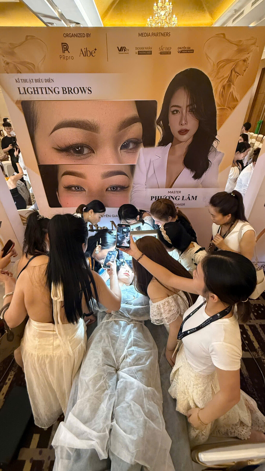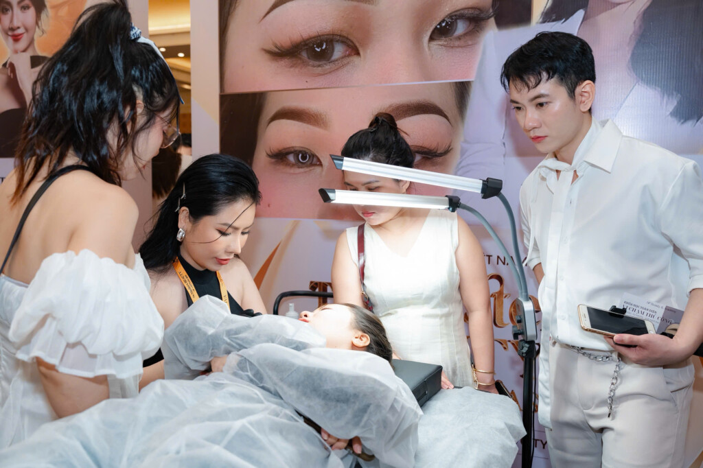 Trình diễn kỹ thuật Lighting Brows, Master Phương Lâm đã chinh phục khán giả bằng đôi tay điêu luyện và khả năng kiểm soát từng hạt mực một cách hoàn hảo. Lighting Brows là kỹ thuật đòi hỏi sự khéo léo trong việc điều chỉnh ánh sáng và màu sắc trên từng sợi chân mày, tạo hiệu ứng chuyển màu tinh tế từ nhạt đến đậm, mang đến cặp mày trong suốt, tự nhiên nhưng vẫn đầy chiều sâu. Không chỉ là một kỹ thuật đơn thuần, Lighting Brows còn được xem là sự kết hợp hài hòa giữa khoa học về màu sắc và nghệ thuật tạo hình, giúp nâng tầm diện mạo khách hàng. Các chuyên gia trong nước và quốc tế tham dự sự kiện đều đánh giá cao phần trình diễn này, bởi Lighting Brows không chỉ khó ở khâu thực hiện mà còn yêu cầu sự am hiểu sâu về nền da, sắc tố và cách phối hợp ánh sáng – điều mà không phải bất cứ chuyên gia nào cũng có thể làm chủ.
